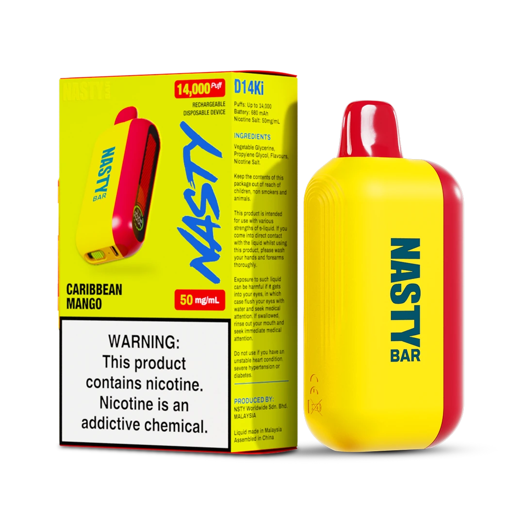 NASTY BAR D14Ki is a sleek rechargeable Nicotine Salt Disposable Device with Double Mesh Coil for bolder and more consistent performance.
