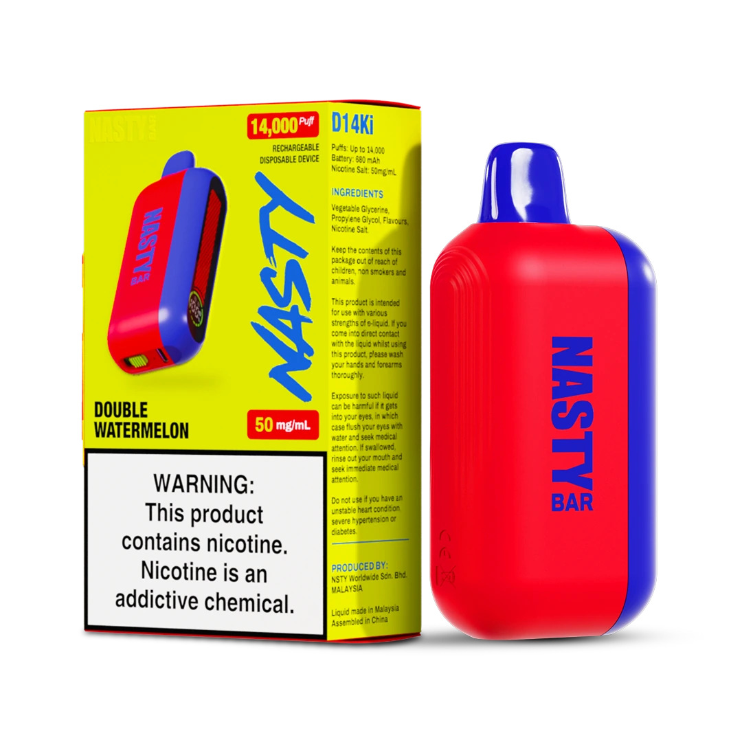 NASTY BAR D14Ki is a sleek rechargeable Nicotine Salt Disposable Device with Double Mesh Coil for bolder and more consistent performance.
