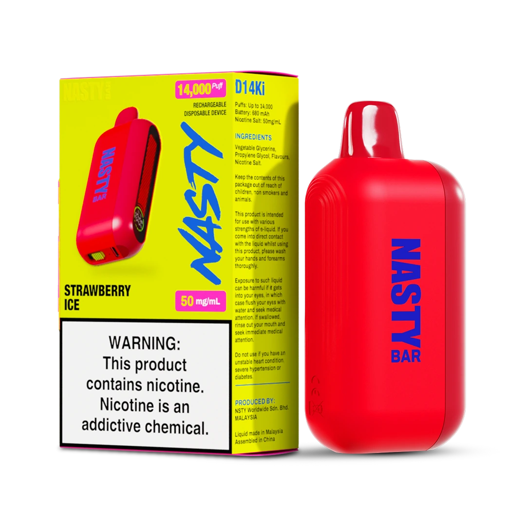 NASTY BAR D14Ki is a sleek rechargeable Nicotine Salt Disposable Device with Double Mesh Coil for bolder and more consistent performance.